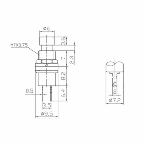 Nombre del producto: interruptor de botón Tipo de acción: momentánea Tipo de contacto: 1NO Voltaje: 250 VCA/1 A, 125 VCA/3 A Terminales 2 pines Diámetro del botón 6 mm Diámetro del agujero 7 mm