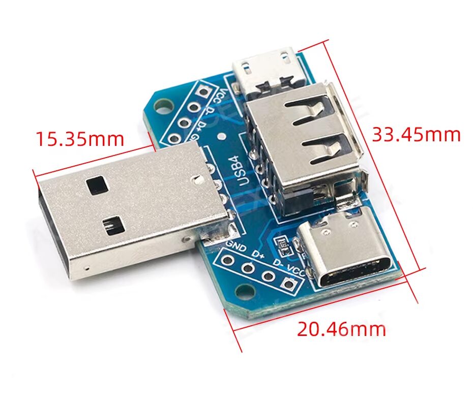 Adaptador que permite conectac cables con conector tipo C, micro USB, en un conector tipo A, permite conexión a las lineas de tension y datos: VCC,GND,D+ y D-.