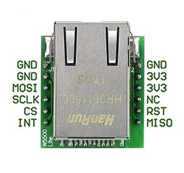 El USR-ES1 es un modulo Ethernet basado en el chip W5500 de Wiznet. Permite agregar conectividad Ethernet a microcontroladores mediante una interfaz SPI. Su principal funcion es proporcionar comunicacion por red cableada (TCP, UDP, IP) de forma sencilla y rapida, sin necesidad de un controlador Ethernet complejo en el microcontrolador.